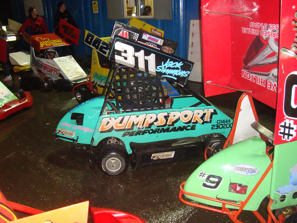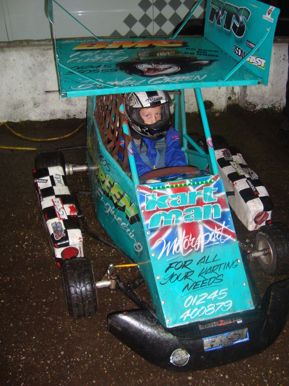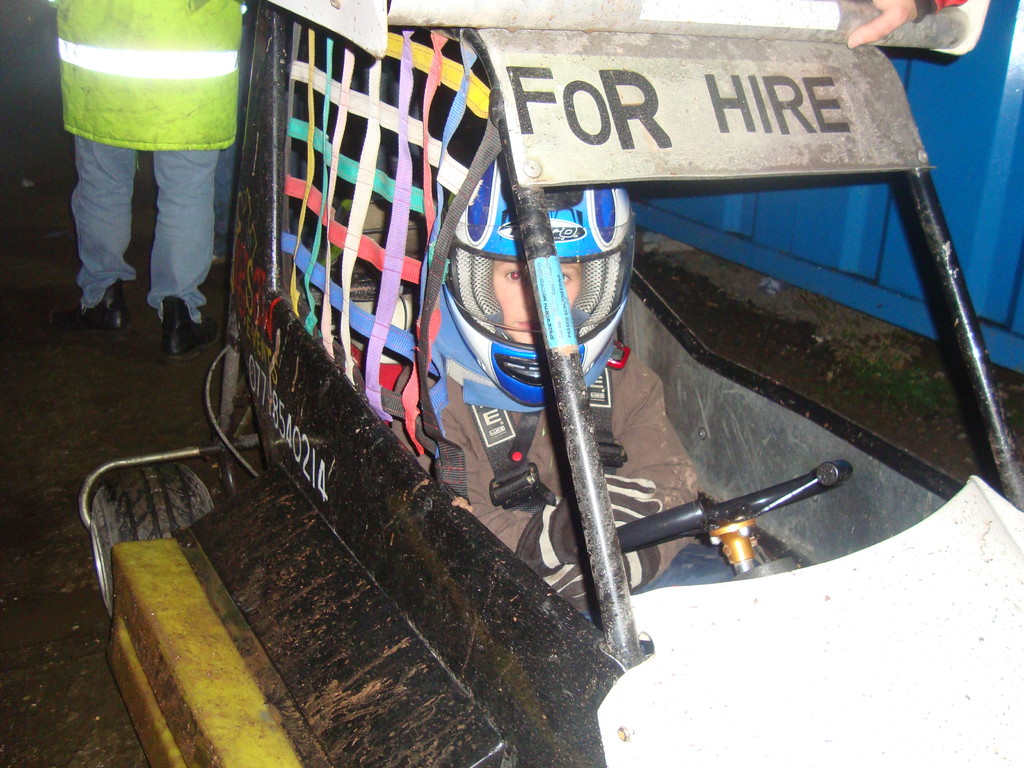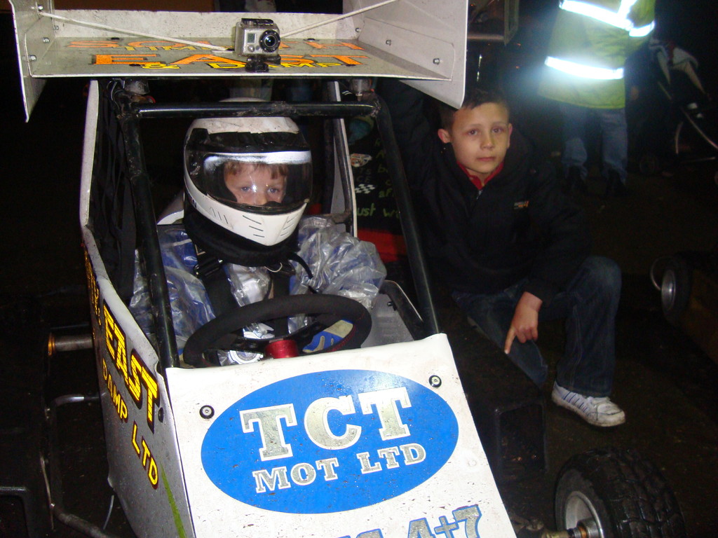 An eventful night at Arena Essex with the weather pretty chilly and at some points raining. The track was very wet and slippery and causing lots of spin outs and crashes throughout the night. Ollie Owen had a fantastic win in the first heat - he was flying. Albert off the pace for the first three races, we think he finds the wet is a bit scary - we were pleased that he took his time and had a safe night. Albert really feels the cold (he has a body like a sparrow) and after sitting waiting for race 3 for 20 minutes he was physically shuddering from the cold. He decided not to go into the final as he was too cold. How wonderful it was that Ollie Owen number 73 went and asked for a trophy for Albert - and he was given one - Albert was really chuffed. THANK YOU OLLIE OWEN you really are a lovely lad. It was first nights racing for Tracey Goodchilds boy Ben MacGregor he did fantastic and a HUGELY impressive doughnut by the exit after one of the heats! - Tracey did well holding it together.