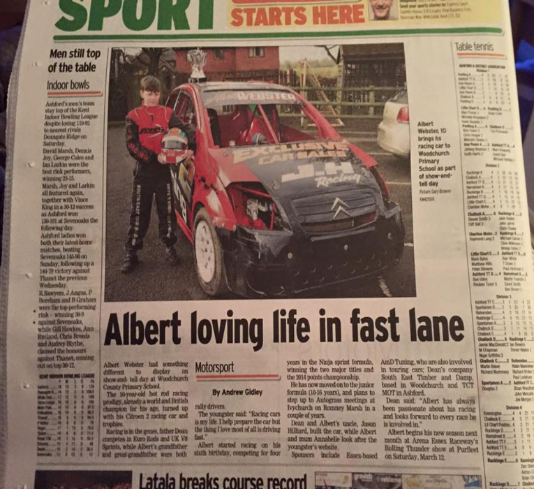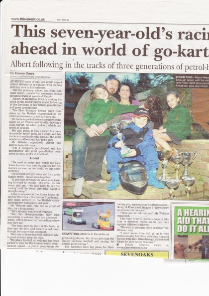 Last week we had a call from Emma at the Sevenoaks Chronicle saying they had read a "tweet" about Albert and his racing and could they do a feature on him for the newspaper. Dean spoke at length with Emma and the local photographer popped round to take some photos. See the article below :